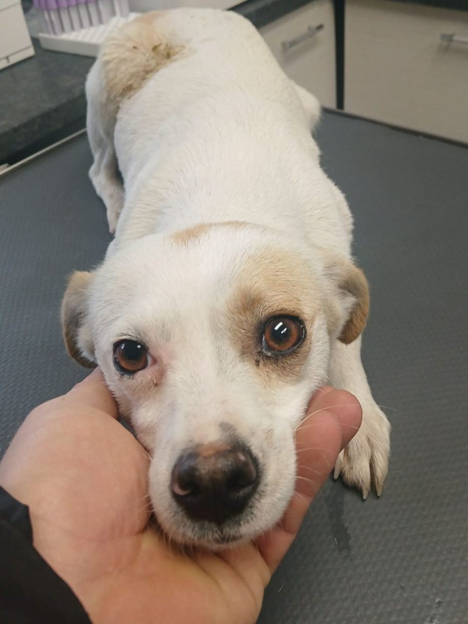 Diese zarte Hündin ist schüchtern, kann sich aber schon etwas auf Menschen und Berührung einlassen.